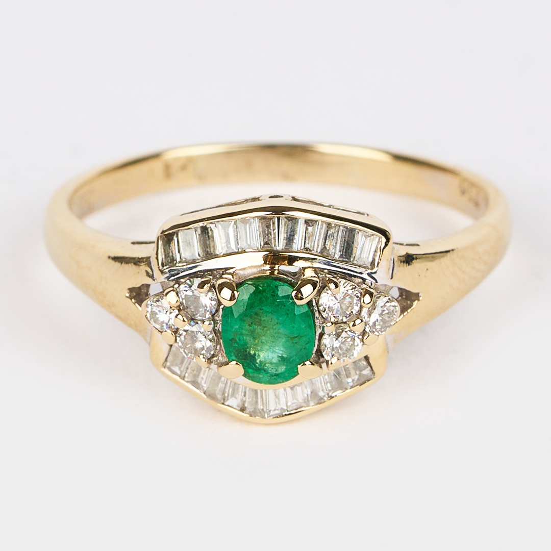 Aur alb de 18 karate,greutate 4.05 grame,decorat cu un smarald de 0.32 CT,culoare verde si 27 diamante-21 baghete si 6 briliante,greutate 0.54 CT,culoare I-J,claritate VS2-SI1.